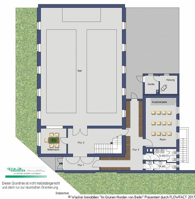 - im EG Eingangsbereich mit Garderobe, großer Saal, Sakristei und Küchezeile im Nebenraum/ EG sowie WCs
