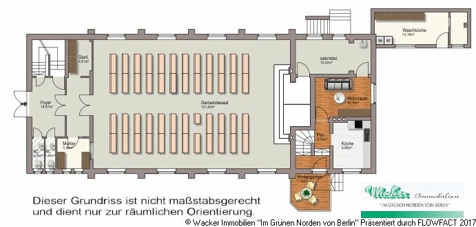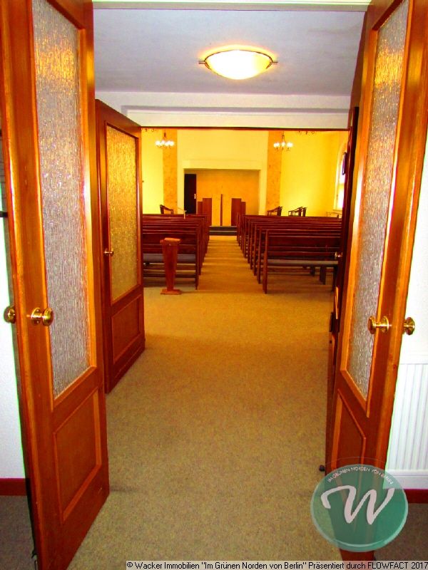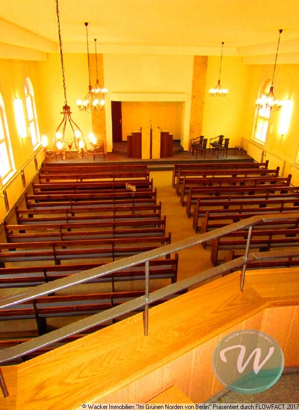 - Saalbau mit großem Gemeindesaal, Arbeitszimmer, Foyer, Garderobe, Mutter-Kind-Raum, gefliestem Sanitärbereich im EG, im OG Treppenaufgang/ Abgang, Unterrichtsraum mit Teeküche und Galerie